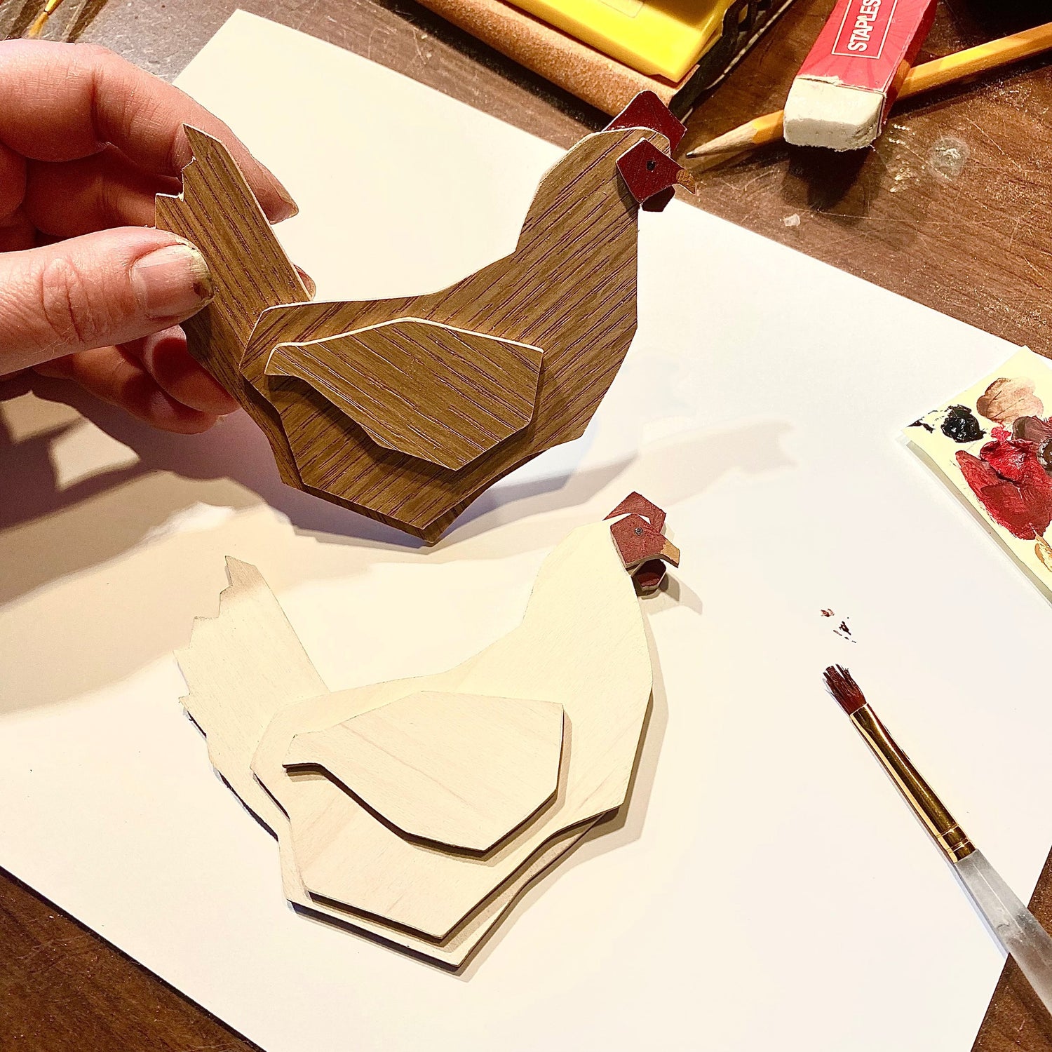 Pour tous nos ornements et la majorité de nos créations sur mesure, nous utilisons des retailles de placage de bois (appliquées sur un substrat HDF) que nous récupérons auprès de plusieurs entreprises locales. Ces morceaux sont soigneusement triés par essence et format, en attendant d’être transformés en pièces uniques!